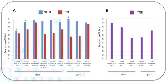 Pearson coefficient correlations between doses estimated by MAA SPECT/CT and post 90Y SIRT imaging [25,30,31,32,33,34,35,36,37,38,39,40]. (A) blue: non-tumoral liver absorbed dose (NTLD), referring to the non-tumoral whole liver or to the non-tumoral liver targeted by SIRT (*). (A) red: tumor absorbed dose (TD). (B) purple: tumor to normal liver ratio uptake (TNR). Abscissa legend: patients and tumor numbers of each study referenced in bracket. Tables in Supplementary Materials provide additional information. Note the better correlation obtained for the NTLD versus TD or TNR.
