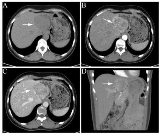 Abdominal contrast-enhanced CT images of the liver. (A) Non-enhanced scan shows a hypodense, well-marginated mass, measuring 6.5 × 5.7 cm. (B–D) A round inhomogeneous enhancement lesion in the early arterial phase and slight washout in the portal phase. White arrows indicate the liver lesion.