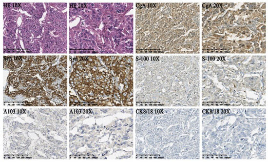 Histopathological features and immunohistochemical profiles of the paraganglioma: CgA (+), Syn (+), S-100 supporting cells (+), A103 (−), CK8/18 (−).