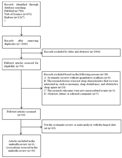 Chicago/Turabian StyleLi, Xiaoying, Donghui Huang, Fanghua Liu, Xinyu Li, Jiale Lv, Qijun Wu, and Yuhong Zhao. 2022. "Sleep Characteristics and Cancer-Related Outcomes: An Umbrella Review of Systematic Reviews and Meta-Analyses of Observational Studies" Journal of Clinical Medicine 11, no. 24: 7289. https://doi.org/10.3390/jcm11247289