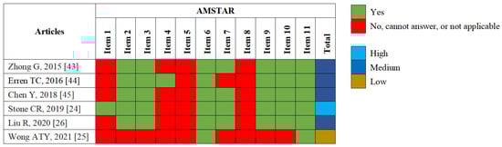 - Gates, A.; Gates, M.; Duarte, G.; Cary, M.; Becker, M.; Prediger, B.; Vandermeer, B.; Fernandes, R.M.; Pieper, D.; Hartling, L. Evaluation of the reliability, usability, and applicability of AMSTAR, AMSTAR 2, and ROBIS: Protocol for a descriptive analytic study. Syst. Rev. 2018, 7, 85. [Google Scholar] [CrossRef]