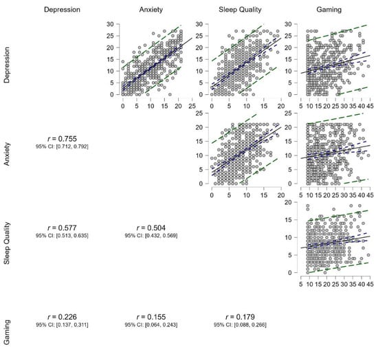 Pearson’s correlation between depression, anxiety, sleep quality, and gaming in a sample of undergraduates (n = 457). Note: All correlations are significant at p < 0.001. The solid gray line represents the regression slope; the purple dashed line shows a 95% confidence interval; and the green dashed line means 95% prediction intervals.