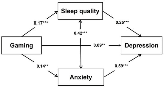 On the other hand, a good mood promotes resilience to stress and strengthens coping mechanisms [56], suggesting a potential mechanism of the depression–insomnia relationship. Additionally, anxiety and depression are highly comorbid [57]. About 45% of depressed individuals experience anxiety [58]. However, research indicated that anxiety precedes depression and contributes to its severity [129]. Therefore, it was reasonable to consider insomnia and anxiety as mediators for the relationship between gaming addiction and depression.