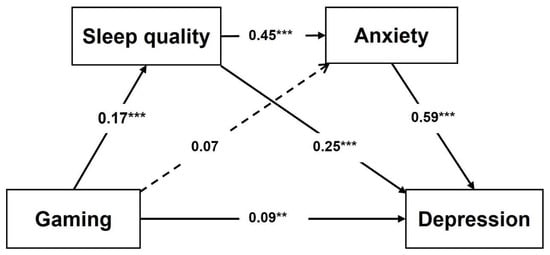 Model 2 of mediation showed that depression can be predicted by gaming indirectly through sleep quality in a simple partial mediation (Table 7 and Figure 3). The other possible mechanism leads partially from gaming via sleep quality and anxiety to depression, considering a serial mediation model. However, the path between gaming and anxiety was insignificant, so anxiety cannot mediate the gaming–depression association. In contrast, sleep quality fully mediates the indirect effect of gaming addiction on anxiety.