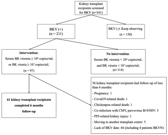 Differences between categorical variables were analyzed by the χ2 test, while an independent t-test or Mann–Whitney test was used to compare quantitative variables. All statistical analyses were conducted using the SPSS software version 20.0 (IBM, Armonk, NY, USA). Comparisons of BKV titers during follow-ups were made by repeated-measurement analysis of variance using the general linear model procedure. Logistic regression analysis combined with a log-rank test was used to calculate the factors corresponding to the decrease in BKV viremia and BKV viruria at six months compared with BKV values at the time of BKV diagnosis. A p-value < 0.05 was considered to represent a significant difference.