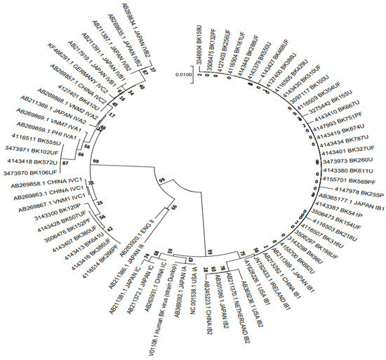 NJ phylogenetic tree clustering of 29 BKV-I and 12 BKV-IV polyomavirus sequences to determine subgroups (n = 41).