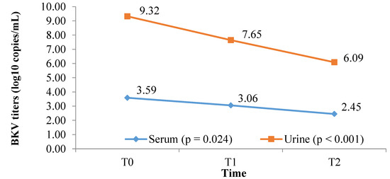 At the six-month follow-up, BKV viruria, as well as BKV viremia, were significantly decreased from 9.32 log10 copies/mL to 6.09 log10 copies/mL and 3.59 log10 copies/mL to 2.45 log10 copies/mL, p < 0.001 and p = 0.024, respectively (Figure 3). At the end of follow-up, 35 out of 41 (85.4%) patients had decreased BKV viruria, and 23 out of 32 (71.8%) patients had reduced BKV viremia. Eleven out of 32 patients (34.4%) cleared BKV viremia, whereas two out of 32 (6.25%) cleared both BKV viremia and viruria. Interestingly, nine (100%) patients with only BKV viruria (mentioned in Table 4) did not develop BKV viremia after six months. In addition, the BKV titers in these nine patients tended to decrease, i.e., 10.98 log10 copies/mL vs. 7.23 log10 copies/mL, although the difference was insignificant (p > 0.05).