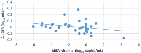 Relationship between changes in eGFR and changes in BKV viremia (n = 41 KTx patients); r = −0.314; p = 0.04.