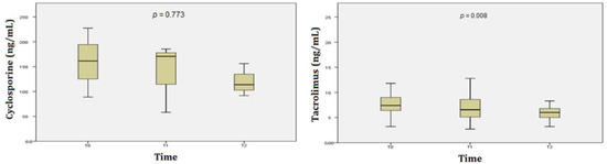 During the follow-up period, both tacrolimus and cyclosporine trough levels decreased; however, the changes were only statistically significant for tacrolimus (p = 0.008 (Figure 5). Median tacrolimus and cyclosporine trough levels at the time of BKV infection diagnosis and the end of the study (6-month follow-up) were 7.5 (3.2–15.8) and 6 (3.2–11.4) ng/mL, p = 0.008; and 160 (88.9–227.6) and 125 ng/mL (91.7–156.1), p = 0.773, respectively.