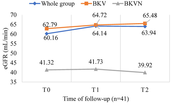 Changes in eGFR during the 6-month follow-up period in 41 KTx patients with BKV infection with p = 0.855 for the whole group (n = 41), p = 0.695 for the BKV group (n = 35), and p = 0.884 for the BKVN (n = 6).