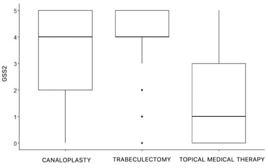 Glaucoma Symptoms Scale (GSS) questionnaire: comparison between canaloplasty, trabeculectomy and topical medical therapy through the Kruskal–Wallis test.
