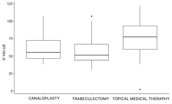 The difference among the G values of the three groups was statistically significant (p < 0.001, ANOVA test), as shown in Figure 2.