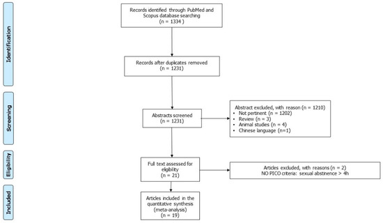 The aforementioned search strategy identified 1334 records. After the exclusion of 103 duplicates, the remaining 1231 articles were screened. Of these, 1202 were judged to be not pertinent for their topic after reading their titles and abstracts, 3 were excluded because they were reviews, and 4 were excluded because they were studies conducted on animals. One study was excluded because it was written in Chinese. Twenty-one studies were carefully read. Among these, two studies were excluded for their experimental design. Finally, 19 articles met our inclusion criteria and were, therefore, included in the analysis [16,17,18,19,20,21,22,26,27,28,29,30,31,32,33,34,35,36,37]. All 19 articles evaluated the effects of a very short abstinence period on sperm parameters and among these, 5 articles also evaluated the SDF rate [16,21,31,32,36] (Figure 1). All studies were judged to be of low quality after the assessment with the Cambridge Quality Checklists (Table 2). The main characteristics of the studies included in the systematic review and meta-analysis are reported in Table 3.