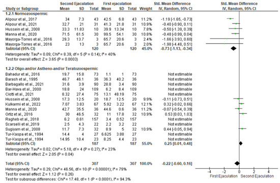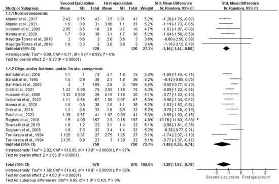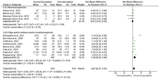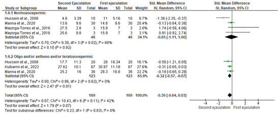 The statistical analysis showed a significant reduction in semen volume after a short period of abstinence in both normozoospermic men [SMD −1.16 (−1.44, −0.88); p < 0.00001] and oligozoospermic, asthenozoospermic, and/or teratozoospermic patients [SMD −1.49 (−2.25, −0.74); p = 0.0001] (Figure 2).