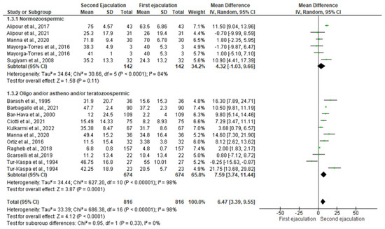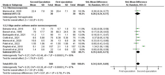 The statistical analysis showed a reduction in sperm concentration in the second ejaculation of normozoospermic men [SMD −0.73 (−1.13, −0.34); p = 00003]. In contrast, sperm concentration significantly increased in patients with abnormal sperm parameters [SMD 0.87 (0.22, 1.51); p = 0.009] (Figure 3).