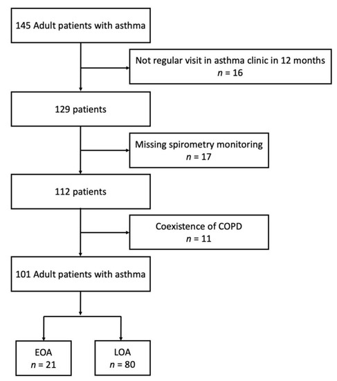 Patients in the pay-for-performance program were screened from April 2019 to December 2021. A total of 145 adult patients with asthma were enrolled. We excluded 16 patients because of missing regular asthma clinic visits, 17 patients because of missing spirometer measurements, and 11 patients because they had coexisting COPD. The remaining 101 asthma patients were eligible for analysis. Figure 1 provides the study flowchart. Among these asthmatics, 21 patients (20.7%) had EOA. The characteristics of patients with EOA and LOA are shown in Table 1. The average onset age of patients with EOA and LOA was 23.4 and 61.8 years, respectively. Patients with EOA were younger, had a longer duration of asthma, had a higher rate of family history of asthma, and had more comorbidities with allergic rhinitis or rhinosinusitis with or without polyps compared with patients with LOA. No difference was observed between the two groups in terms of gender, smoking habits, weight status, exacerbations in the last year, medications, or ACT score. The pre-bronchodilator FVC and FEV1 were higher in patients with EOA than in those with LOA. Regarding allergic status, the proportion of atopy was higher in the EOA group than in the LOA group.