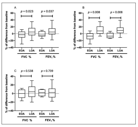 Change of forced vital capacity (FVC) and forced expiratory volume in 1 s (FEV1) in patients with early-onset asthma (EOA) and late-onset asthma (LOA) after 12-month treatment in the total cohort (A), patients <65 years old (B), and patients ≥65 years old (C). Boxplots show the median (bar), the first and third quartiles (box), and the 1st and 99th percentiles (whiskers) of the biomarkers level for each asthma status.