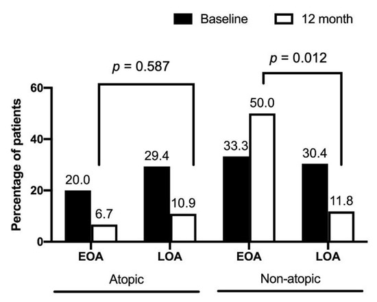 Table 2 shows the pulmonary function at 12 months for patients with EOA and LOA. The mean difference in the percentage of predicted FVC and FEV1 from baseline declined in the EOA group, whereas it increased in the LOA group. Patients with EOA had greater declines in FEV1 (−2.1 ± 8.4 vs. 6.8 ± 13.1, % of the predicted value, p = 0.037) and FVC (−4.6 ± 12.0 vs. 6.1 ± 13.6, % of the predicted value, p = 0.023) than patients with LOA over a 12-month period (Figure 2). Both groups had similar baseline exacerbation rates. No difference was noted between the groups in clinical outcomes at 12 months. In the total asthma cohort (Figure 3), the incidence of total acute exacerbation events (28.7% vs. 12.9%, p = 0.009), emergency room visits (12.9% vs. 1.0%, p = 0.001), and hospitalizations (11.9% vs. 0%, p = 0.0003) decreased after 12 months of treatment. In the subgroups of atopic asthma patients, the incidence of AE decreased in both the EOA (20% (3/15) vs. 6.7% (1/15)) and LOA (29.4% (10/34) vs. 11.8% (3/34)) groups after 12-month treatment (Figure 4). In the subgroups of nonatopic asthma patients, the incidence of AE decreased in the LOA (32.4% (14/46) vs. 10.9% (5/46)) group after 12-month treatment (Figure 4). However, the incidence of AE increased in the EOA (33.3% (2/6) vs. 50% (3/6)) group after 12-month treatment. In the nonatopic subgroups, patients with EOA had a significantly higher exacerbation rate at 12 months than those with LOA (50% vs. 11.8%, p = 0.012). In contrast, the pulmonary function and acute exacerbation at 12 months were similar in the atopic and non-atopic groups (Table 2).