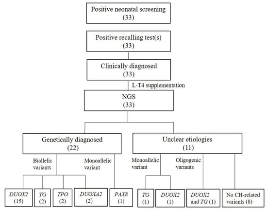 The typical presentations of CH include myxedematous face, macroglossia, umbilical hernia, hypotonia, large fontanels, a distended abdomen, decreased activity and increased sleep, constipation, feeding difficulty and prolonged neonatal jaundice [5,13]. However, these clinical manifestations are often subtle at birth, and even negative in some cases with elevated thyroid-stimulating hormone (TSH) levels but normal thyroid hormone levels, making diagnosis of etiology and genetic counseling greatly challenging [14]. In recent years, next-generation sequencing (NGS) has facilitated the identification of the etiology of genetic conditions, and it is now possible to analyze the genetic etiologies of CH patients simultaneously and systematically [7,15].