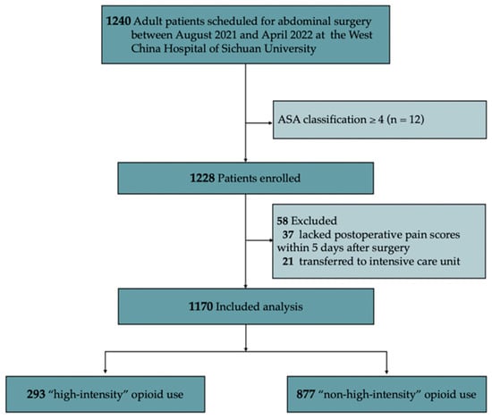 APA StyleChen, D., Li, X., Chen, Y., Zeng, H., Liu, J., & Li, Q. (2022). Opioid Dose, Pain, and Recovery following Abdominal Surgery: A Retrospective Cohort Study. Journal of Clinical Medicine, 11(24), 7320. https://doi.org/10.3390/jcm11247320