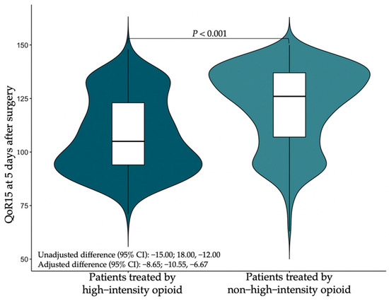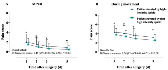 | Pain Scores | Patients Treated by High-Intensity Opioid n = 293 | Patients Treated by Non-High-Intensity Opioid n = 877 | Unadjusted Differences (95% CI) | p | Adjusted Differences (95% CI) ** | p |