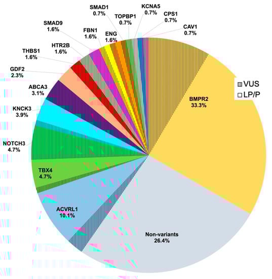 Relative contributions of 17 established PAH risk genes detected in idiopathic paediatric PAH in a cohort of 129 cases. Risk genes included BMPR2, ACVRL1, TBX4, NOTCH3, KCNK3, ABCA3, GDF2, THBS1 (also known as TSP1), HTR2B, SMAD9, ENG, TOPBP1, SMAD1, KCNA5, CPS1, CAV1, and FBN1. PAH, pulmonary arterial hypertension; VUS, variants of uncertain (or unknown) significance; LP/P, likely pathogenic or pathogenic variants in PAH-related genes; % is the percentage of both LP/P and VUS in each gene.