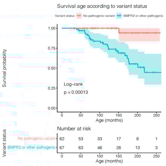 In our study, patients with BMPR2 or other pathogenic variants had a higher age at diagnosis compared with patients without variants. This is consistent with the US paediatric IPAH cohort, with the most common age of onset at 10 years in BMPR2 variants, which is older than TBX4 mutation carriers, whose age of onset was less than 5 years []. In contrast, adult-onset patients with BMPR2 variants were much younger than those with other variants [,]. That may indicate that patients with early onset may not necessarily have a poor prognosis.