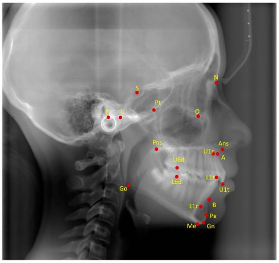 Cephalometric landmarks. N Nasion, S Sella, P Porion, Co Condylion, Pt Pterion, Or Orbitale, Pns Posterior nasal spine, Ans Anterior nasal spine, A Point A, B Point B, Pg Pogonion, Gn Gnathion, Me Menton, Go Gonion, U1r Root Apex Upper central incisor, U1t Tip Upper central incisor, L1r Root Apex Lower central incisor, L1t Tip Lower central incisor, U6d Distal Upper first molar, L6d Distal Lower first molar.