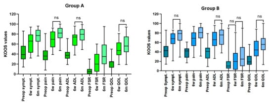 Group A—IFP resected, Group B—IFP preserved. KOOS scores in both groups (preoperative, 6 weeks and 6 months) of patients obtained at all check-ups. In comparison to preoperative values, all scores significantly improved at 6 months; when scores from consecutive examinations were compared as statistically significant (Friedman and post hoc Dunn tests) improvement was observed for most of them (with few exceptions, denoted with the ns markings) The following abbreviations for KOOS domains were used: sympt.-symptoms, ADL—activities of daily living, FSR—function–sports and recreation, QOL—quality of life.