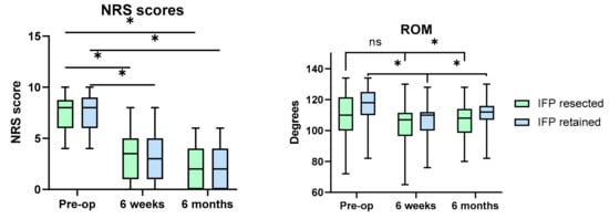 NRS scores and ROM in patients with resected (green) and retained (blue) IFP preoperatively, at 6 weeks and 6 months follow-up. Asterisks indicate statistically significant difference between values; ns—lack of thereof.