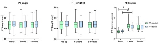 Performing TKA did not have an effect on the length but was associated with a significant increase PT thickness postoperatively in both groups (both p < 0.0001; Dunn test); this was followed by a minor decrease in thickness at 6 months (Figure 3). IFP resection did not affect the PT length and thickness as there were no differences between both groups preoperatively, at 6 weeks and 6 months (Table 4).
