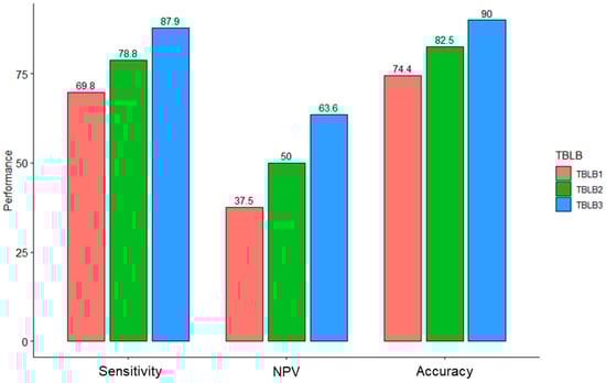 Performance of ENB and R-EBUS-guided TBLB. Diagnostic accuracy was boosted after adding another modality. NPV, negative predictive value; TBLB1, ENB-guided lung biopsy only; TBLB2, ENB-guided lung biopsy plus needle aspiration; TBLB3, ENB-guided lung biopsy and aspiration plus R-EBUS-guided lung biopsy.