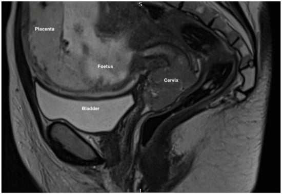 MRI sagittal scan showing the gravid uterus, anteverted and anteflexed, with a single foetus in cephalic presentation with cervical mass seen distally.