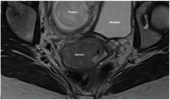 Magnetic resonance imaging (MRI) pelvis reported an anteverted anteflexed gravid uterus with a single foetus in cephalic presentation. A large mass was seen centered on the ectocervix filling the vaginal fornix and extending into the cervical canal measuring 38 × 53 × 25 mm. (Figure 1 and Figure 2) There was also felt to be possible parametrial extension at the superior right aspect of the mass. There was no evidence of lymphadenopathy or metastatic disease, which was further confirmed on computed tomography (CT) scan of the chest, abdomen and pelvis. MDT discussion confirmed radiological stage IIb disease and management proposals were considered.
