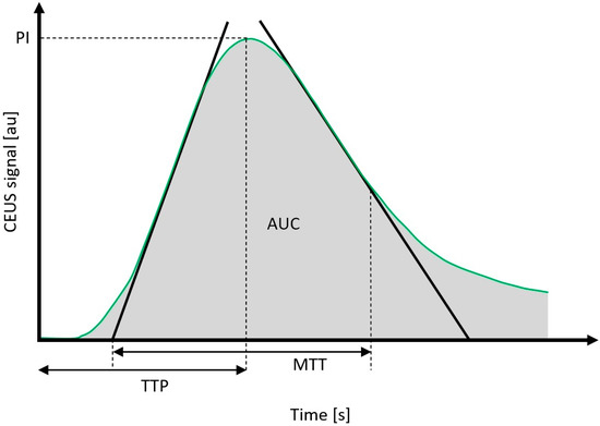 The quantitative evaluation of the CEUS-derived parameters involved the analysis of: (1) rise time (RT, in seconds), representing the time during which the time-intensity curve (TIC) increases from the starting point to 50% of the peak value; (2) peak intensity (PI, in dB), representing the maximum signal intensity measured in the selected ROI; (3) mean transit time (MTT, in seconds), representing the time during which the curve decreases from the starting point to 50% of the PI; (4) normalized mean transit time (nMTT, in seconds), representing the mean transit time normalized by circumjacent parotid tissue and expressed in ratios; (5) area under the curve (AUC, in arbitrary units), representing the area under the entire time-intensity curve; (6) time from peak to one half (TPH, in seconds), representing the time from peak to half of the absolute increment; (7) time to peak (TTP, in seconds), representing the time from the contrast agent injection to the maximum intensity of the contrast agent signal; (8) normalized time to peak (nTTP, in seconds), representing the time to peak normalized by circumjacent parotid tissue and expressed in ratios; (9) rising slope (RS, in dB/s), calculated using the formula (peak intensity-baseline intensity)/rise time; (10) wash-in-rate (WiR, in arbitrary units), describing the rate of change of contrast agent inflow; and (11) wash-in-perfusion-index (WiPI, in arbitrary units), defined as wash-in area under the curve divided by RT. The graphical representation of the selected CEUS-derived parameters is presented in Figure 1.