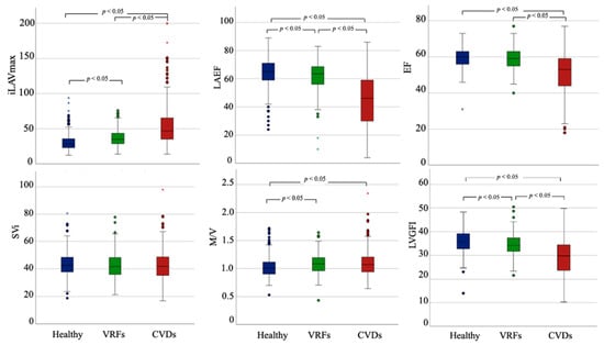 The comparison of DHM metrics among the subsets of participants (i) without VRFs or CVD (healthy), (ii) with VRFs, but without CVD, and (iii) with CVD is displayed in Table 2, Figure 1, and Supplementary Figure S1. Regarding LV parameters, there was a stepwise decline in LV function and a significant worsening in EDVi, ESVi, and LV mass when considering CVDs compared to the other two groups. Moreover, the VRFs and CVDs subset had higher LVM/LVEDV than the healthy cohort. More concentric LV remodeling patterns were associated with VRFs, while prevalent CVDs were associated with more eccentric LV remodeling, even without reaching statistical significance in the comparison of LVM/LVEDV. No significant difference could be detected comparing SVi among the subgroups. When the SVi was computed with LV global volume to derive LVGFI, this index was significantly different in all the comparisons. When considering the LA parameters (LAVi max, LAVi min, EFLA), significant differences between patients with VRFs and healthy subjects were reported. The CVDs cohort showed the largest LA volumes and the most compromised LA function.