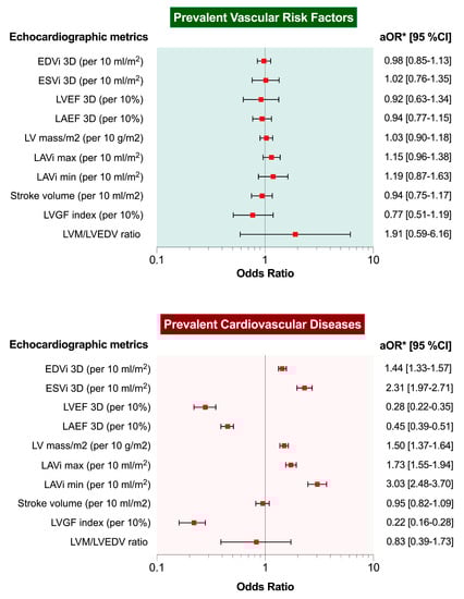Associations between 3D-DHM echocardiographic metrics and vascular risk factors or prevalent cardiovascular disease. * Adjusted analysis for sex and age; EDVi = end-diastolic volume indexed; ESVi = end-systolic volume indexed; LAEF = left atrial ejection fraction; LAVi = left atrial volume indexed; LVEF = left ventricular ejection fraction, LVGFI = left ventricle global function index, LVM = left ventricular mass, Svi = stroke volume indexed.