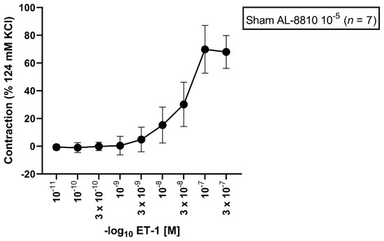 Contractile assessment after incubation with AL-8810 10−5 M followed by an ET-1 series under normal physiological conditions. ET-1 (10−11–3 × 10−7 M) induced a dose-dependent vasoconstriction. Values are expressed as mean ± standard deviation.