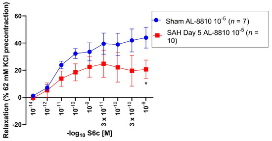 3.2. Effect of 62 mM KCl and AL-8810 10−5 M Precontraction on Sarafotoxin S6c-Induced Vasorelaxation in Sham and SAH Segments