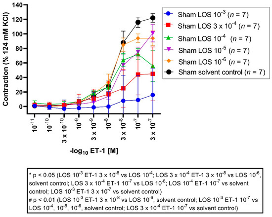 Vasocontraction assessment after ET-1 administration and prior preincubation with LOS in different concentrations in sham segments. ET-1 induced a dose-dependent vasoconstriction, which was dose-dependent antagonised by LOS (10−3 M, 3 × 104 M, 10−5 M, 10−6 M). Values are expressed as mean ± standard deviation and compared to the solvent control group. * p < 0.05 vs. LOS 10−4 M, # p < 0.01 vs. LOS 3 × 10−4 M, # p < 0.01 vs. LOS 10−3 M.