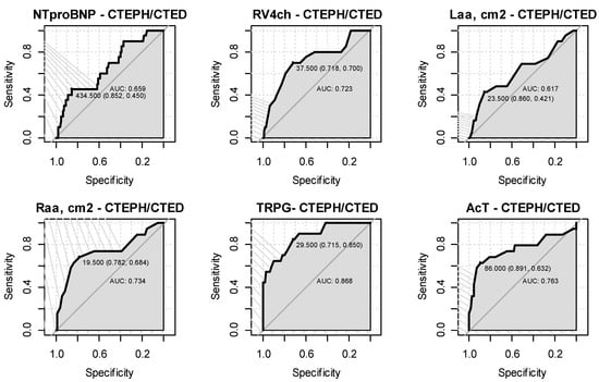 ROC curves for particular parameters as diagnostic test for CTEPH/CTEPD vs. patients with symptoms but without CTEPH/CTEPD (numbers of each chart include AUC value as well as optimal cut-off point with specificity and sensitivity values).