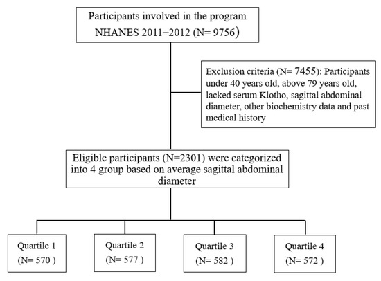 This study enrolled individuals between 40–79 years of age from the National Health and Nutrition Examination Survey (NHANES) dataset. The NHANES survey is a cross-sectional survey of the US population, and the data consist of interview questionnaires, psychological assessments, physical examinations, and biochemical tests. Datasets spanning two years are available for analysis, and we acquired the dataset from the 2011–2012 study cycle (Supplementary Materials), owing to limited data of SKC in NHANES 2011–2012. A total of 9756 respondents were screened, and participants with missing data, such as anthropometric parameters, serum Klotho, demographic features, and previous medical history, were excluded. Finally, 2301 participants met the inclusion and exclusion criteria, and their data were analyzed. Figure 1 shows the selection process.