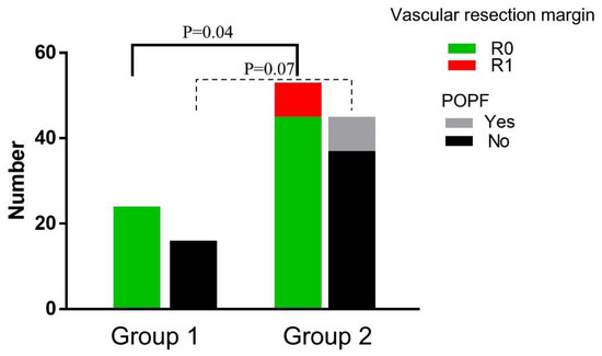 Perioperative patient characteristics are summarized in Table 1. There was no major difference in the distribution of age (p = 0.75), gender (p = 0.76), preoperative leucocytes (p = 0.11), hemoglobin (p = 0.59), platelets (p = 0.45), albumin (p = 0.33), total bilirubin (p = 0.42), CA19-9 (p = 0.90), operating time (p = 0.24), tumor differentiation (p = 0.24), tumor size (p = 0.18), lymph node metastasis (p = 0.62), postoperative complications (p = 0.12), or hospital-stay (p = 0.37) among the two groups. The R0 rate of the vascular margin of Group 1 is higher than Group 2 (100% vs. 84.9%, p = 0.04) (Figure 2, Supplementary Figure S1).