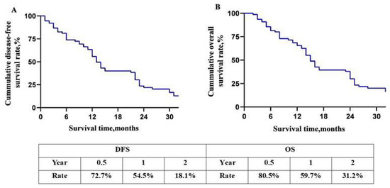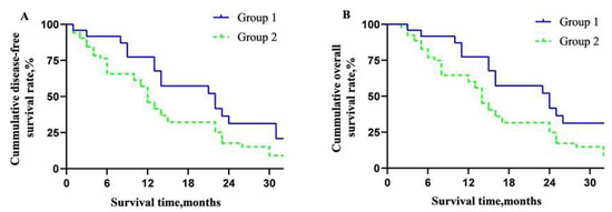 For all 77 patients, the DFA rate and OS rate of 0.5-, 1-, and 2-year were 72.7%, 54.5%, 18.1%, and 80.5%, 59.7%, and 31.2%, respectively (Figure 3A,B). The overall DFS time and MST were 12 and 14 months. The DFS rates of 0.5-, 1- and 2-year of the two groups were 83.3%, 66.7%, 29.2%, and 68.0%, 49.1%, and 13.2%, respectively (p = 0.05, Figure 4A). The OS rates of 0.5-, 1- and 2-year were 83.3%, 66.7%, 41.7%, and 79.2%, 55.6%, and 26.4%, respectively (p = 0.04, Figure 4B). The overall median DFS time and MST of Group 1 and Group 2 were 14, 16, and 11, 13 months, respectively.