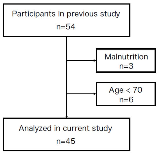 A diagram of study participants. Participants were selected from the database of our previous study [7]. Among 54 participants, 9 were excluded due to malnutrition and being younger than 70 years old; therefore, 45 participants were ultimately analyzed in the present study.
