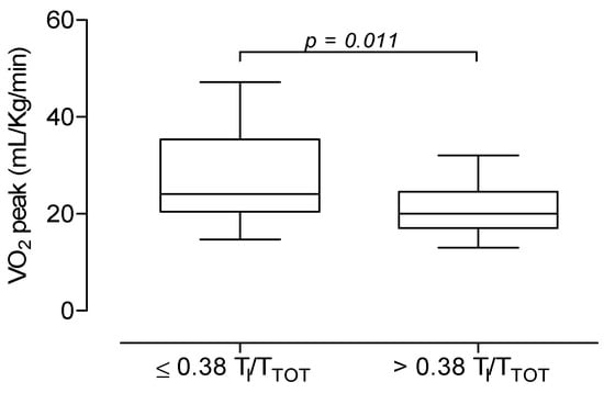 Finally, when LC patients were subdivided according to the TI/TTOT cut-off value of 0.38, 29 out 42 LC patients had TI/TTOT > 0.38 and showed lower values in VO2 peak (21 ± 5 mL/kg/min vs. 27 ± 10 mL/kg/min; p = 0.011) (Figure 4) and in maximal workload (114 ± 28 watts vs. 144 ± 60 watts; p = 0.035), and greater values in VE/VCO2 slope (31 ± 4 L vs. 28 ± 3 L; p = 0.036) than the remaining 13 patients with TI/TTOT ≤ 0.38.