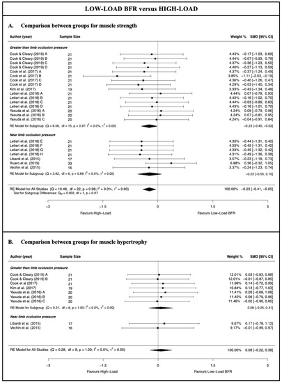 The following supporting information can be downloaded at: https://www.mdpi.com/article/10.3390/jcm11247389/s1, File S1: Search strategy; File S2: Risk of bias summary and graph; File S3: Sensitivity and Publication Bias Funnel Plots for the Comparison in Muscle strength be-tween Low-Load Blood Flow Restriction Resistance Training and High-Load Resistance Training; File S4: Sensitivity and Publication Bias Funnel Plots for the Comparison in Muscle Hypertrophy between Low-Load Blood Flow Restriction Resistance Training and High-Load Resistance Training; File S5: Sensitivity and Publication Bias Funnel Plots for the Comparison in Muscle Strength be-tween Low-Load Blood Flow Restriction Resistance Training and Traditional Low-Load Resistance Training; File S6: Sensitivity and Publication Bias Funnel Plots for the Comparison in Muscle Hypertrophy between Low-Load Blood Flow Restriction Resistance Training and Traditional Low-Load Resistance Training.