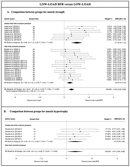 No subgroup meta-analysis by the degree of the limb cuff pressure could be performed for muscle hypertrophy, given that no study had applied near limb occlusion pressure.
