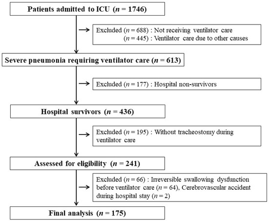 Data from adult patients aged ≥18 years were retrospectively evaluated. The inclusion period was from 1 December 2015 to 30 November 2020. To evaluate the 1-year mortality rates after ICU admission, the patient survival status was evaluated until 10 March 2022. Patients were included if (1) they had received ventilator care for more than 24 h; (2) pneumonia, including both community- and hospital-acquired pneumonia was the main diagnosis for MV at ICU admission; (3) they underwent tracheostomy during hospital stay; (4) they did not have a documented deglutition dysfunction before hospital admission; and (5) they survived the hospital stay. The purpose of this study is to develop a predictive model for dysphagia and evaluate the ability of the model to predict long-term mortality. Unfortunately, in order to design this model effectively and attempt to predict long-term mortality rates, we needed to assess surviving patients. Patients with intact oropharyngeal deglutition before ICU admission were included, even if they had underlying chronic neurologic diseases, such as cerebrovascular accidents, intracerebral hemorrhage, and Alzheimer dementia. Patients were excluded if they had undergone tracheostomy or had an irreversible deglutition dysfunction (e.g., on nasogastric tube feeding) before ICU admission. In addition, two patients who had cerebrovascular accidents during their hospital stay were excluded.