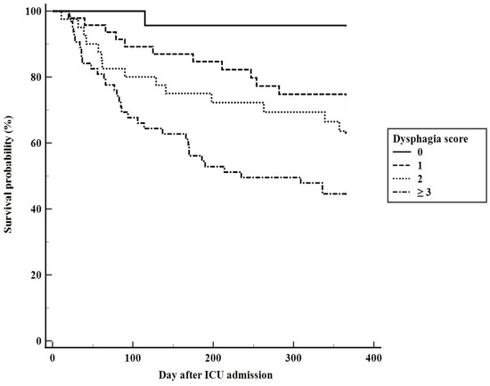 Kaplan–Meier analyses of patient survival curves 1 year after ICU admission as a function of dysphagia score.